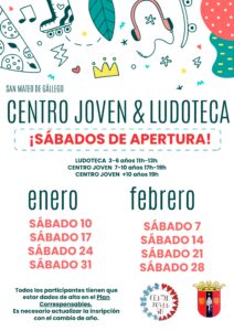 10Ene2026A Centro Joven SMDGgratuitoSábados de apertura de ludoteca y centro joven ¡Te esperamos! Publicaciones relacionadasHoguera de San Antón09/01/2026San Mateo de Gállego celebra con éxito la X edición de la 5K / 10K23/12/2025Nochevieja orquesta y dj22/12/2025Uvas Infantiles y Carrera San Silvestre22/12/2025Ludoteca y centro joven 20/1219/12/2025Parque Navideño16/12/2025